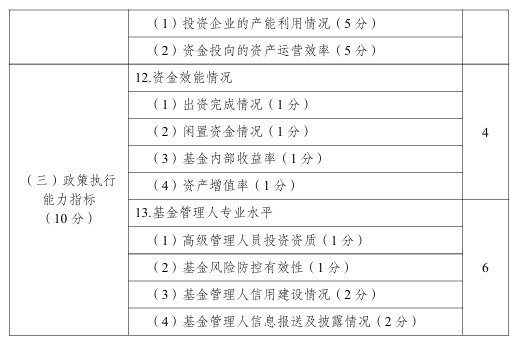 (三)政策执行能力指标,主要评价资金效能情况及基金管理人专业水平等。