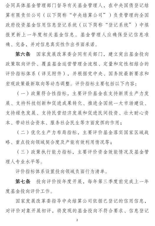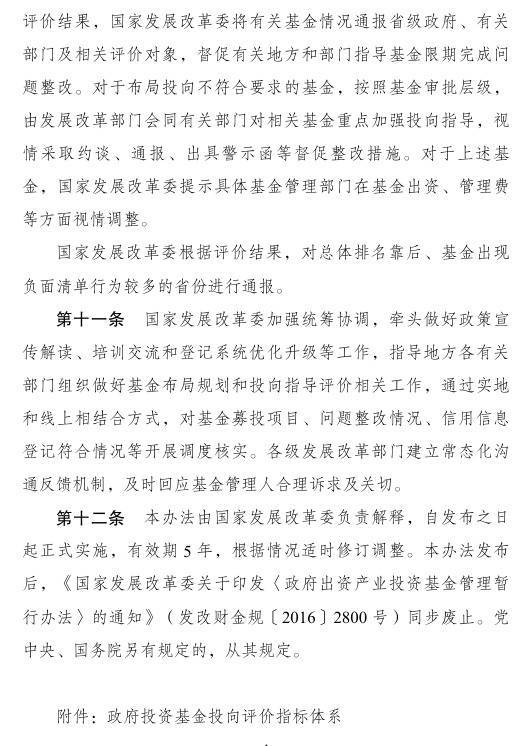 对于出现投向领域负面行为的基金,不予出具投向评价结果,国家发展改革委将有关基金情况通报省级政府、有关部门及相关评价对象,督促有关地方和部门指导基金限期完成问题整改。